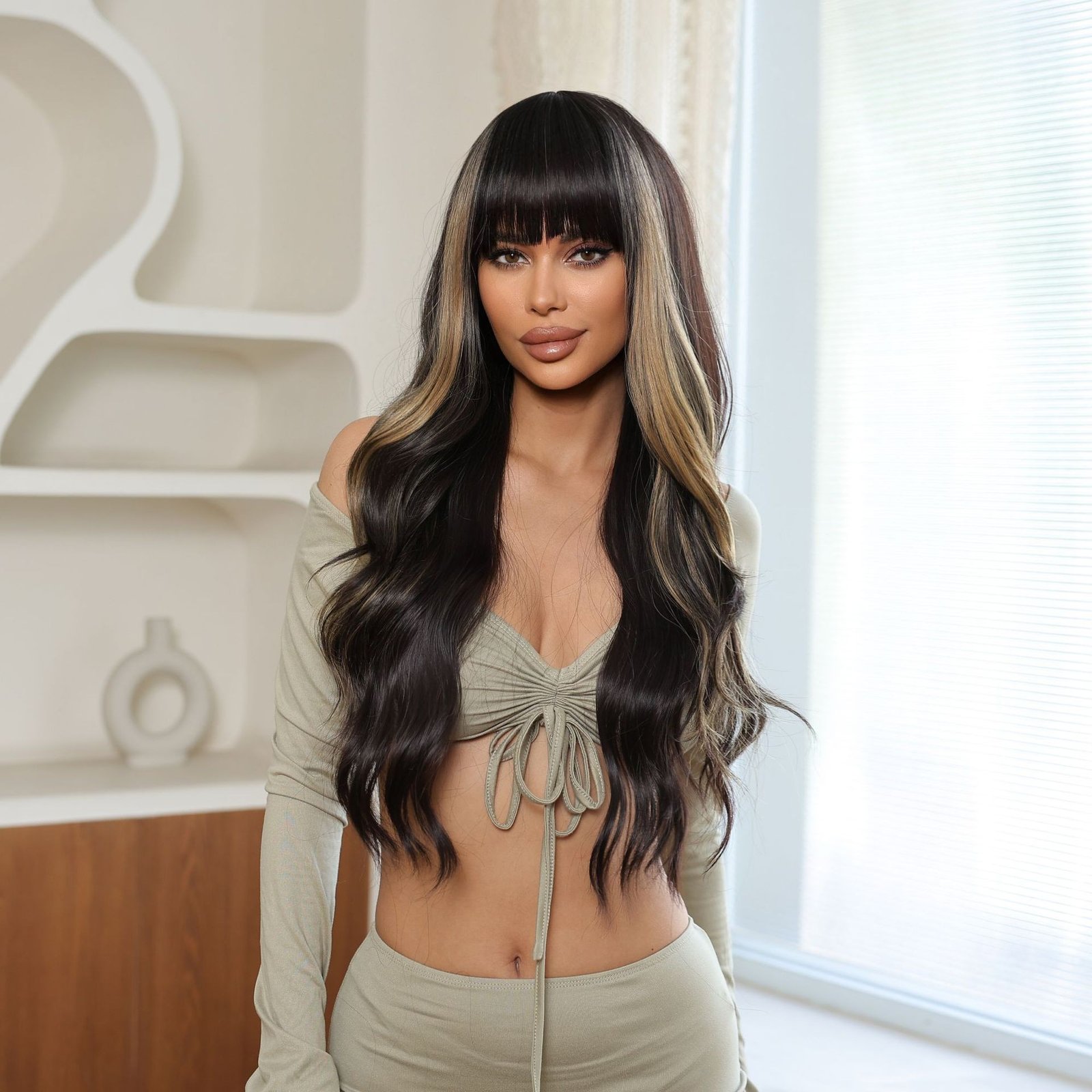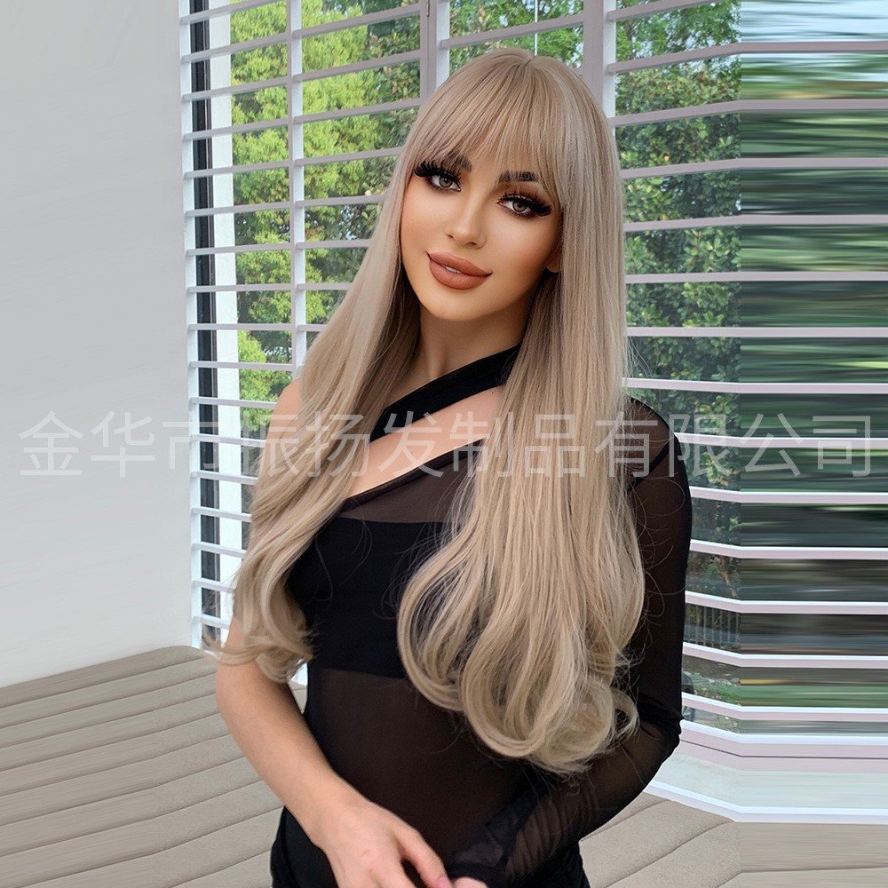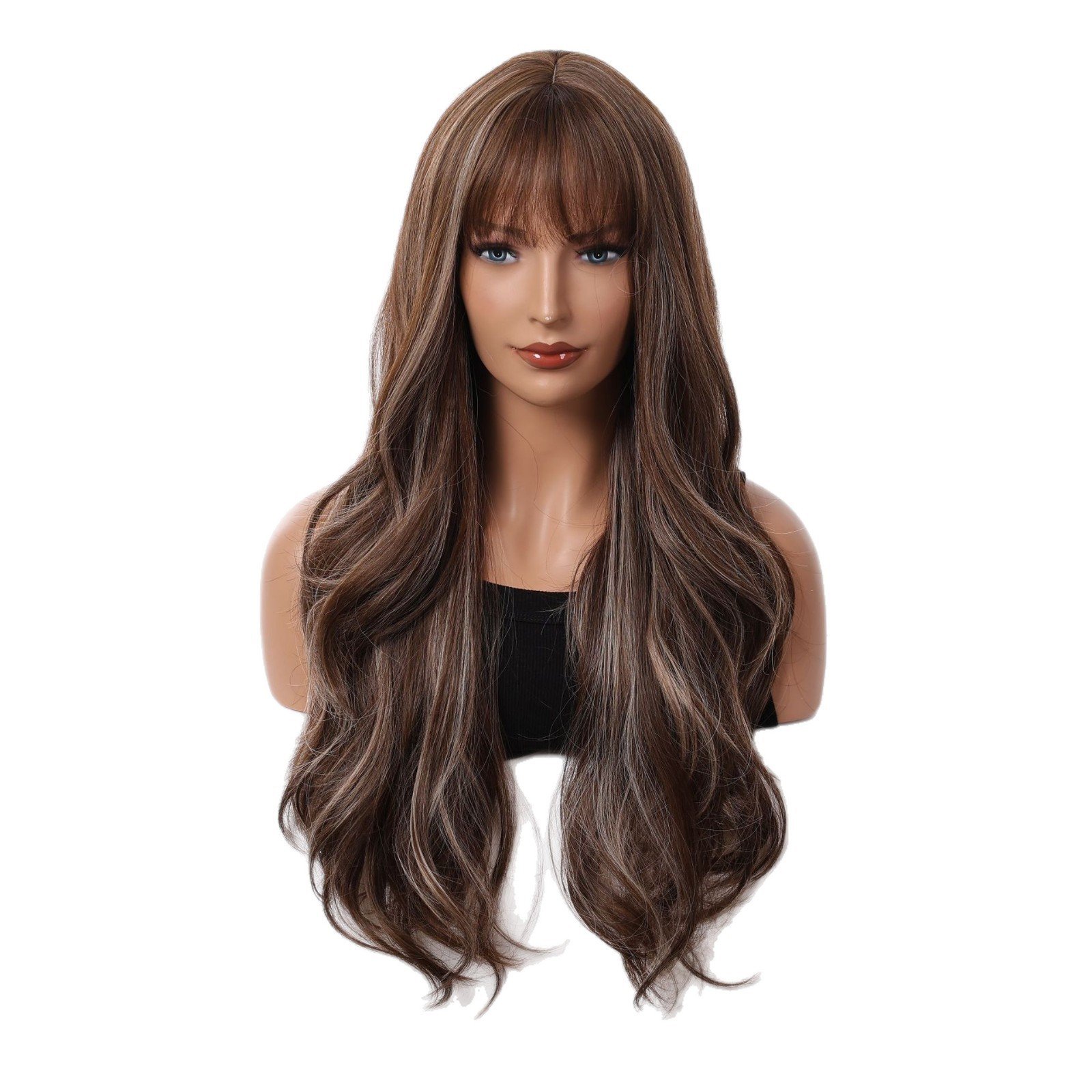 欧美跨境新款长卷发假发女士齐刘海全头套黑棕色多色机制化纤假发