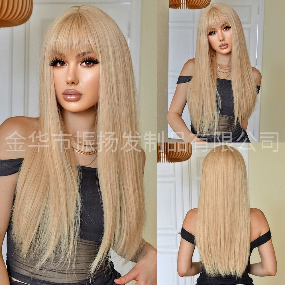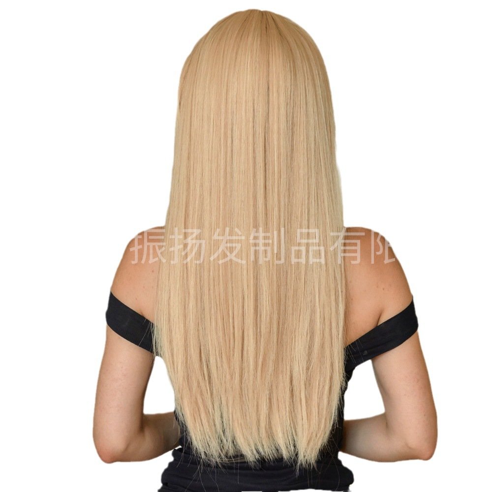 欧美跨境热销金色假发女士日常齐刘海长直发化纤高温丝全头套假发