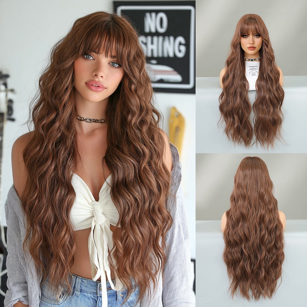 High-Quality 30-Inch Extra-Long Curly Wig for Women, Brown Color, Big Waves with a Straight Bangs, Natural and Soft Full Head Wig