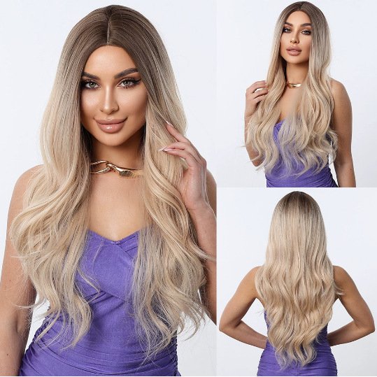 Chic Long Wavy Brown Highlighted Wig – Natural Gradient Large Wave Synthetic Hair