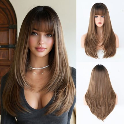 Elegant Dark Brown Bob Wig with Airy Fringe – Soft Straight Synthetic Fiber