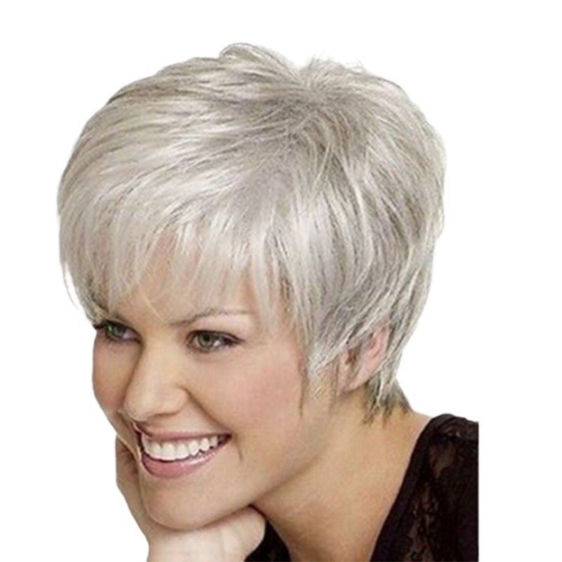 Senior Grey White Short Curly Wig with Side Swept Bangs – Heat Resistant Synthetic Hair