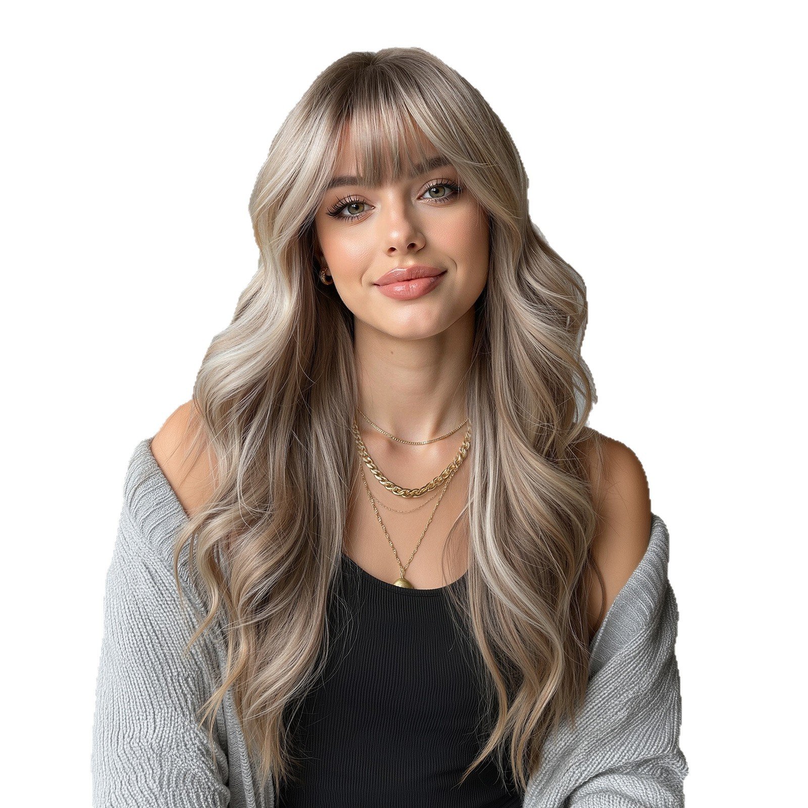 Cross border European and American style gradient gray gold long curly hair wig, air bangs, big waves, natural and realistic synthetic full head cover