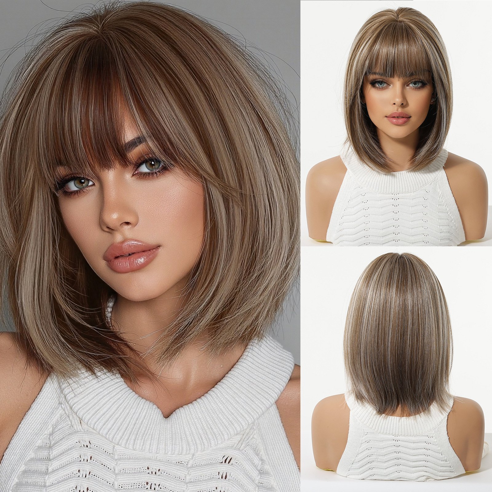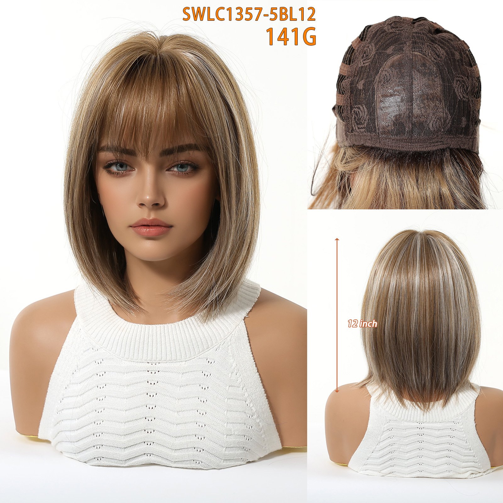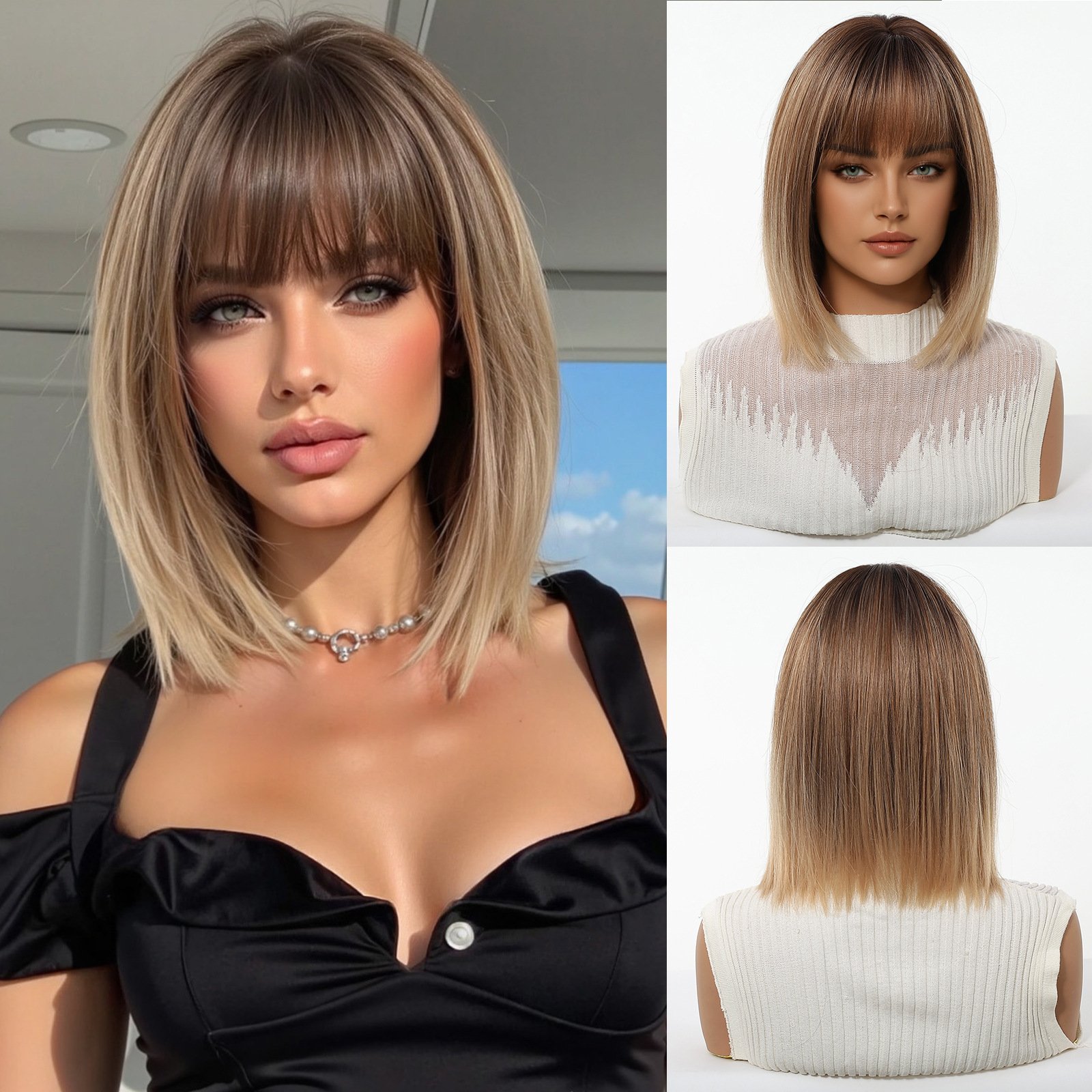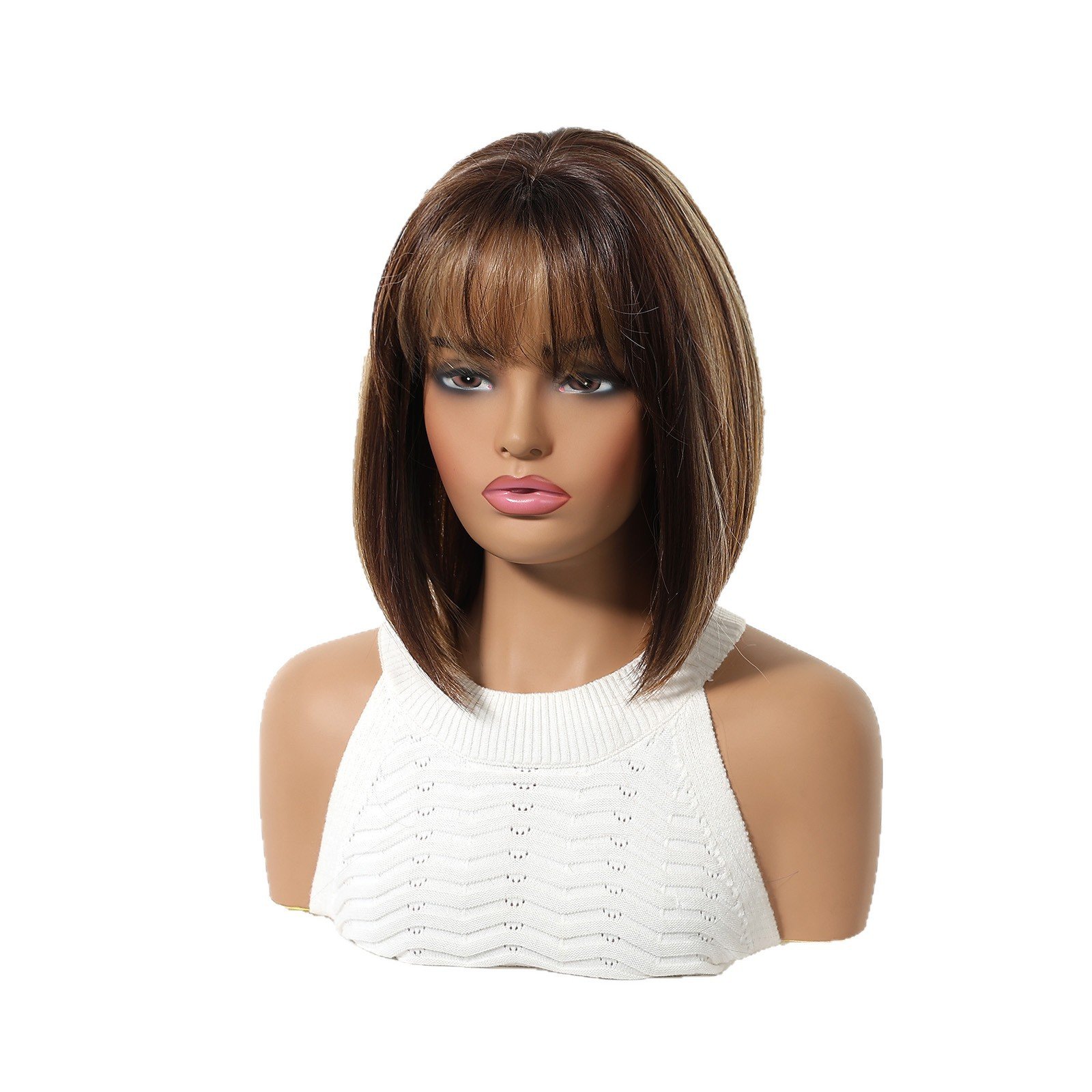 Cross border gradient brown wig, dyed bob, air bangs, short straight hair, natural and realistic synthetic hair, full head