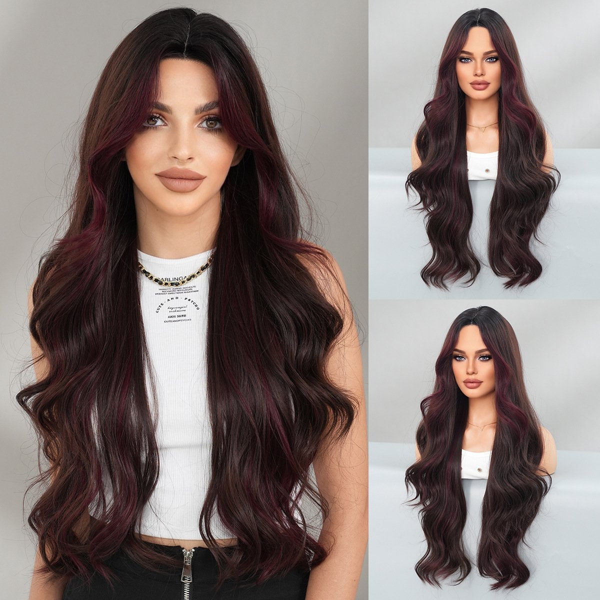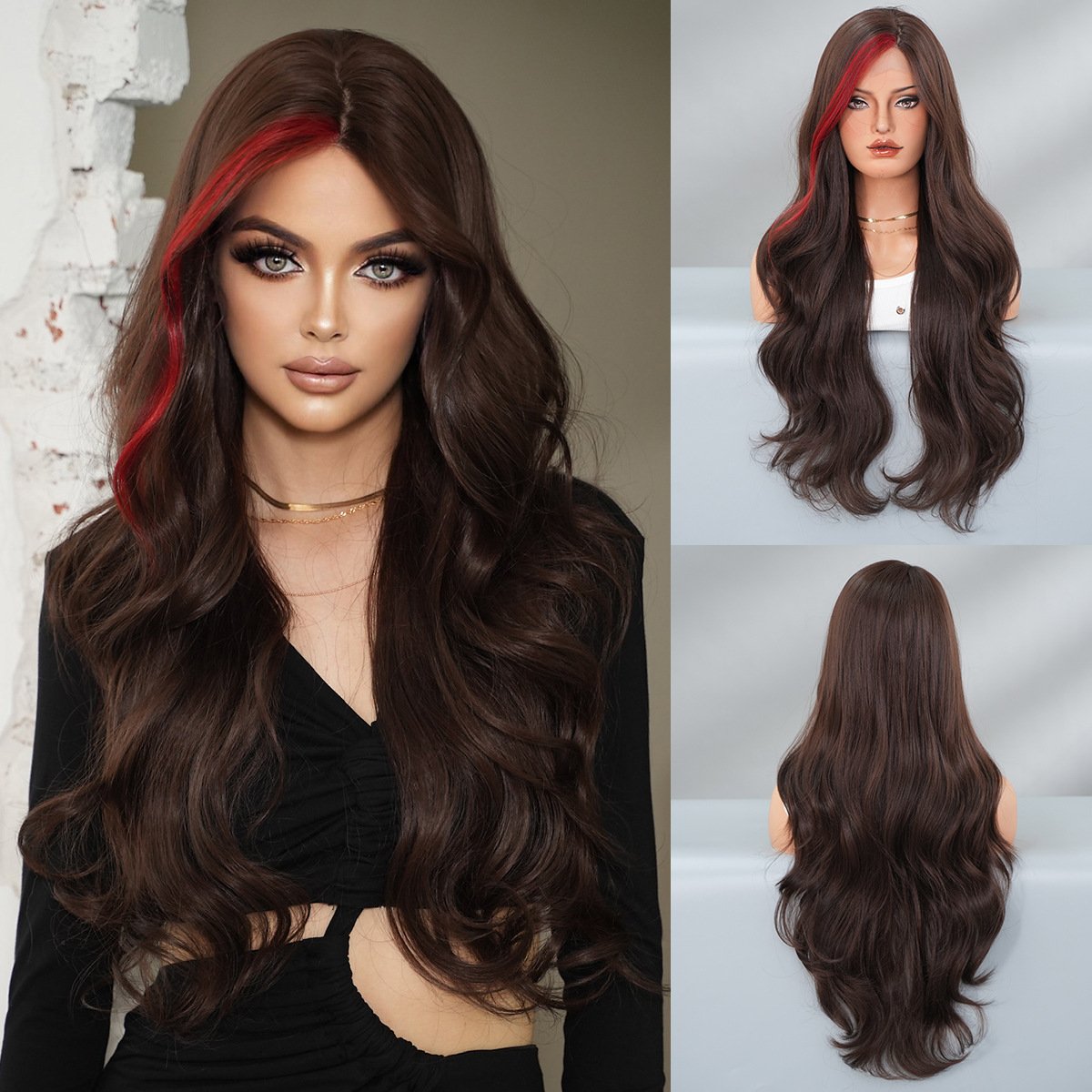 Deep Espresso Brown Wig with Vibrant Crimson Streaks