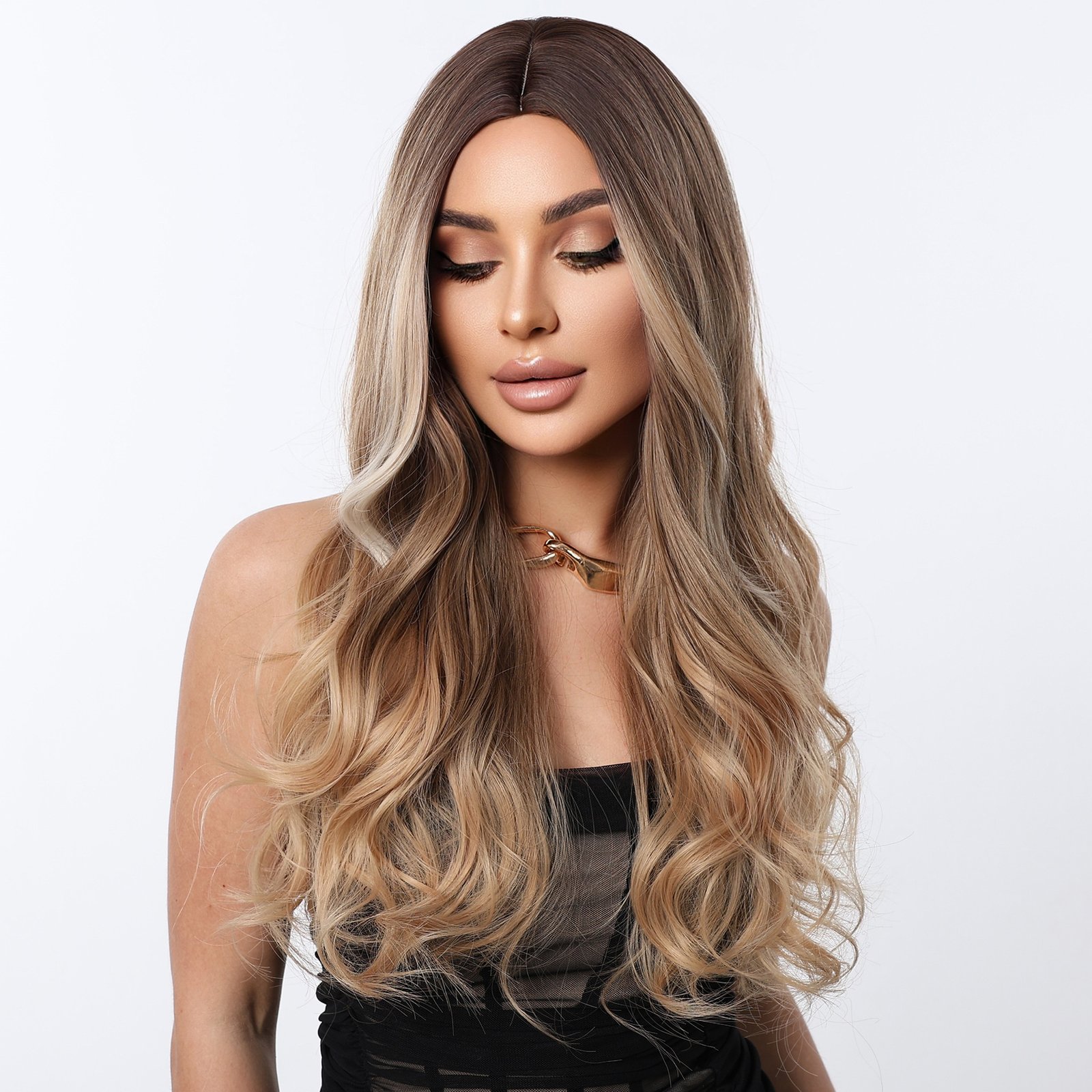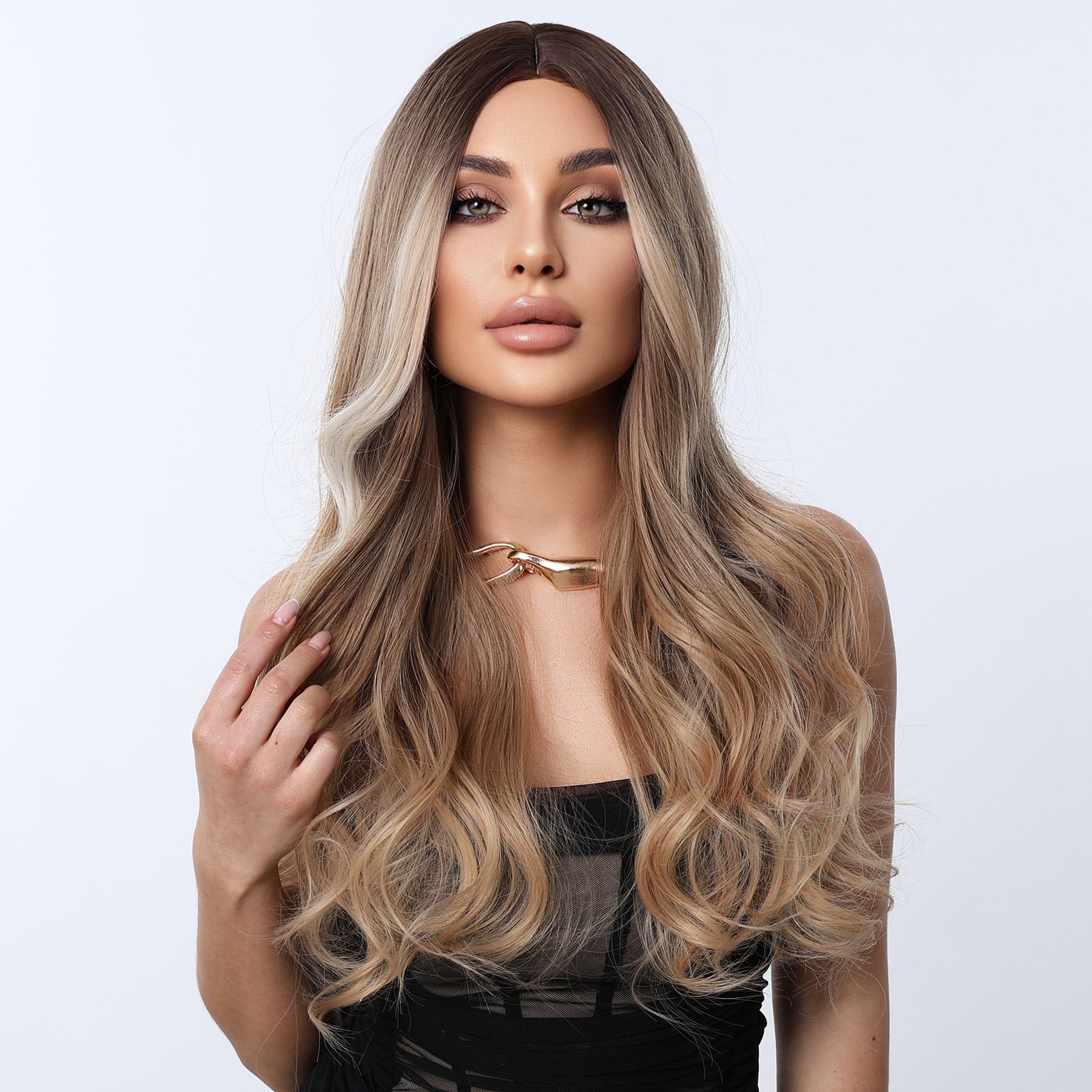 Elegant Long Wavy Ombre Brown Wig – Fashionable Synthetic Full Headpiece