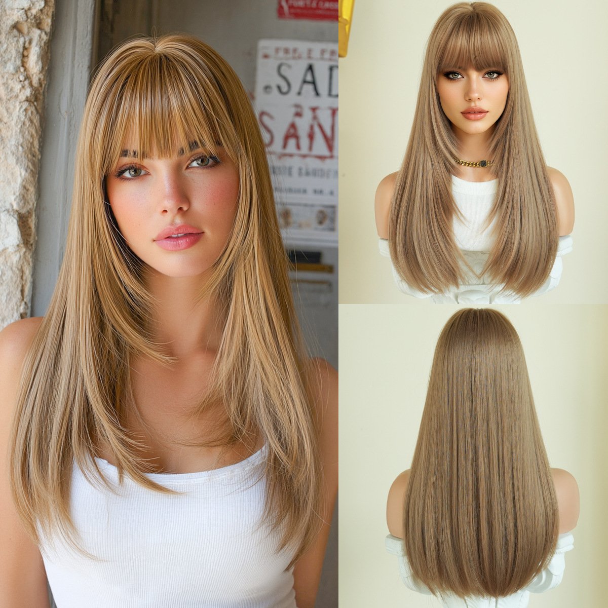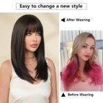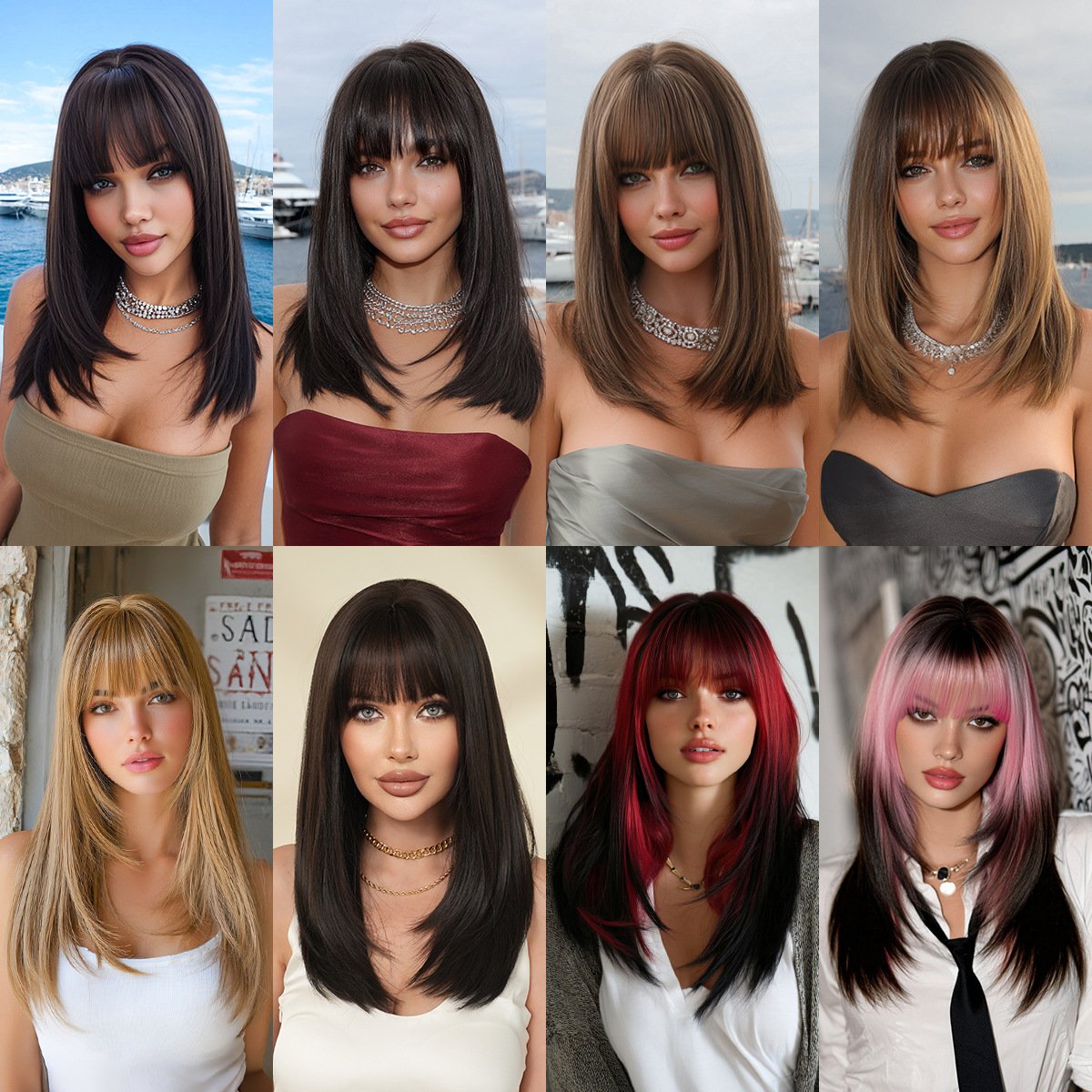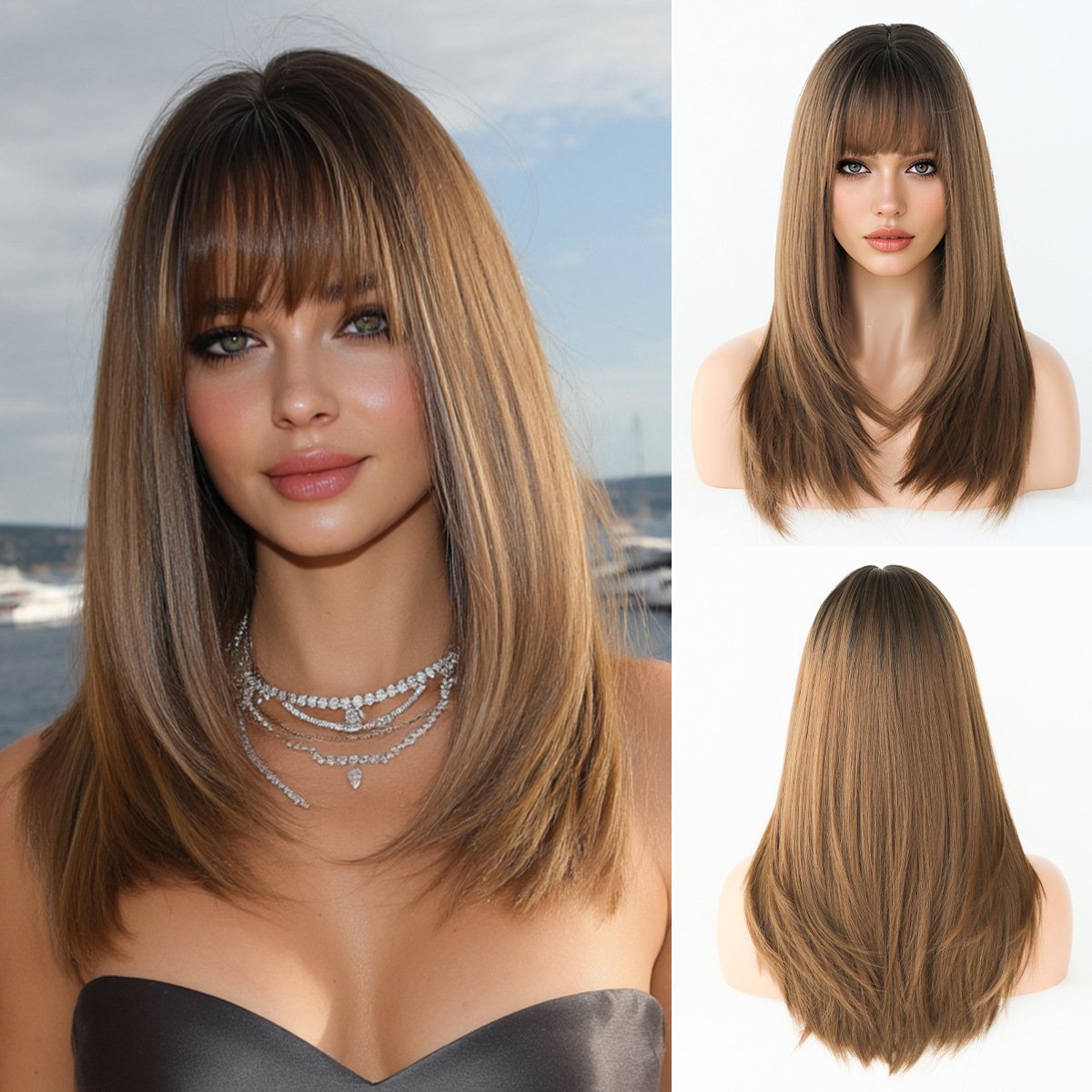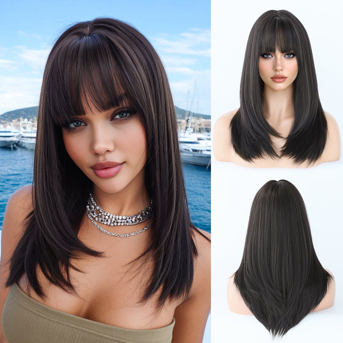 High quality 20in shoulder-length wig women’s natural black layered wig natural full head cover straight hair with bangs