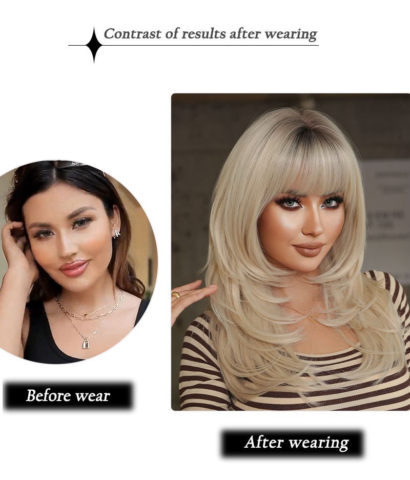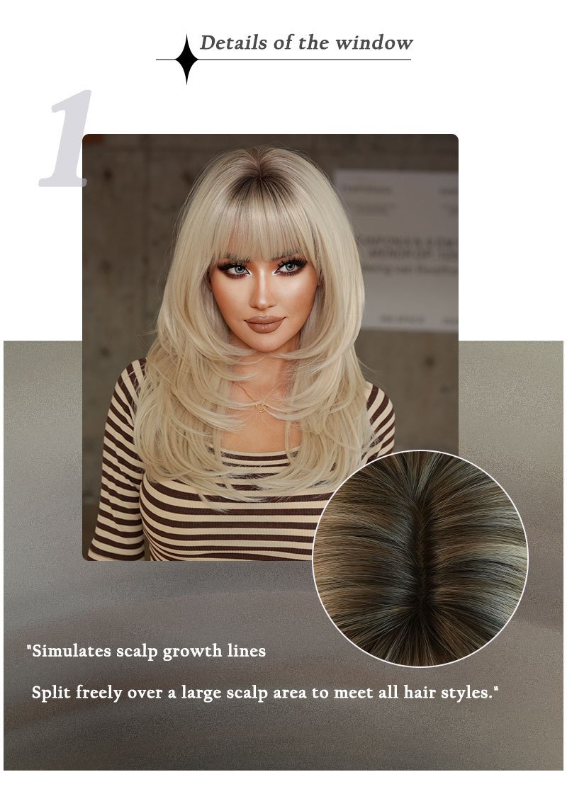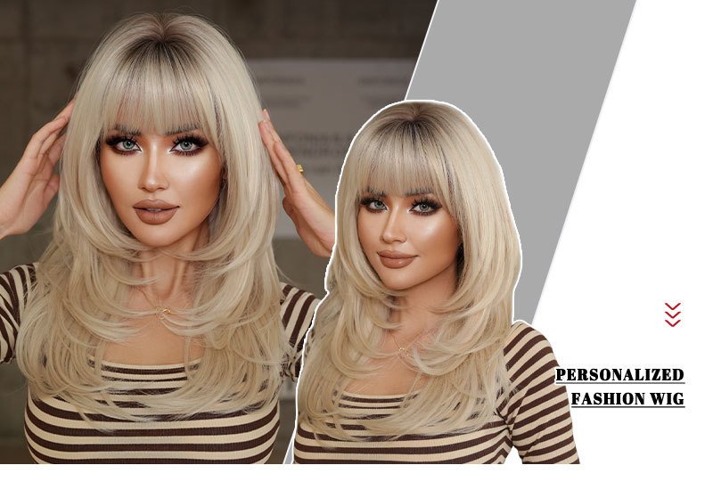 High Quality 24in Platinum Wig Women’s European and American Hierarchical Textured Long Hair Natural Heat Resistant Fluffy Wig with Qi Bangs