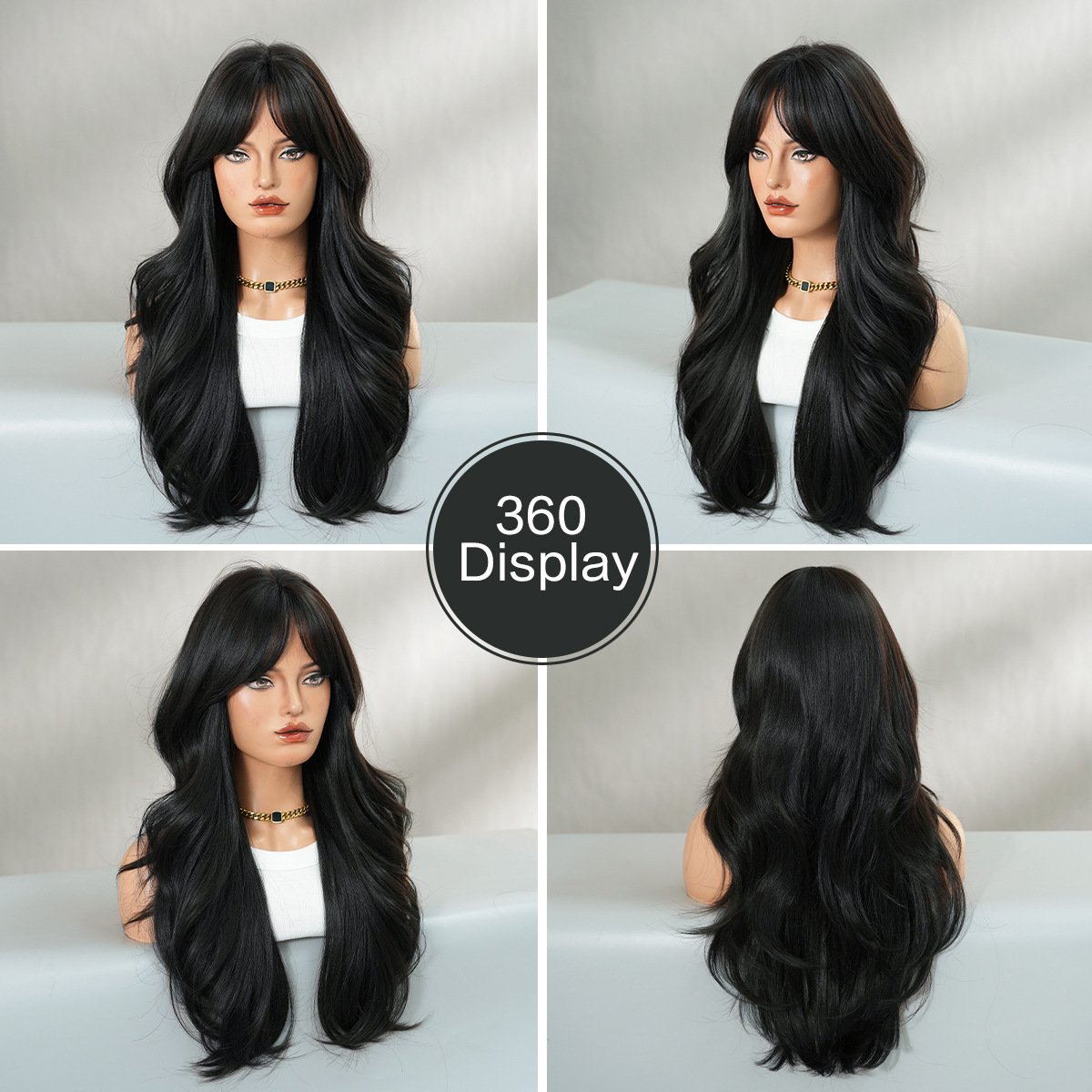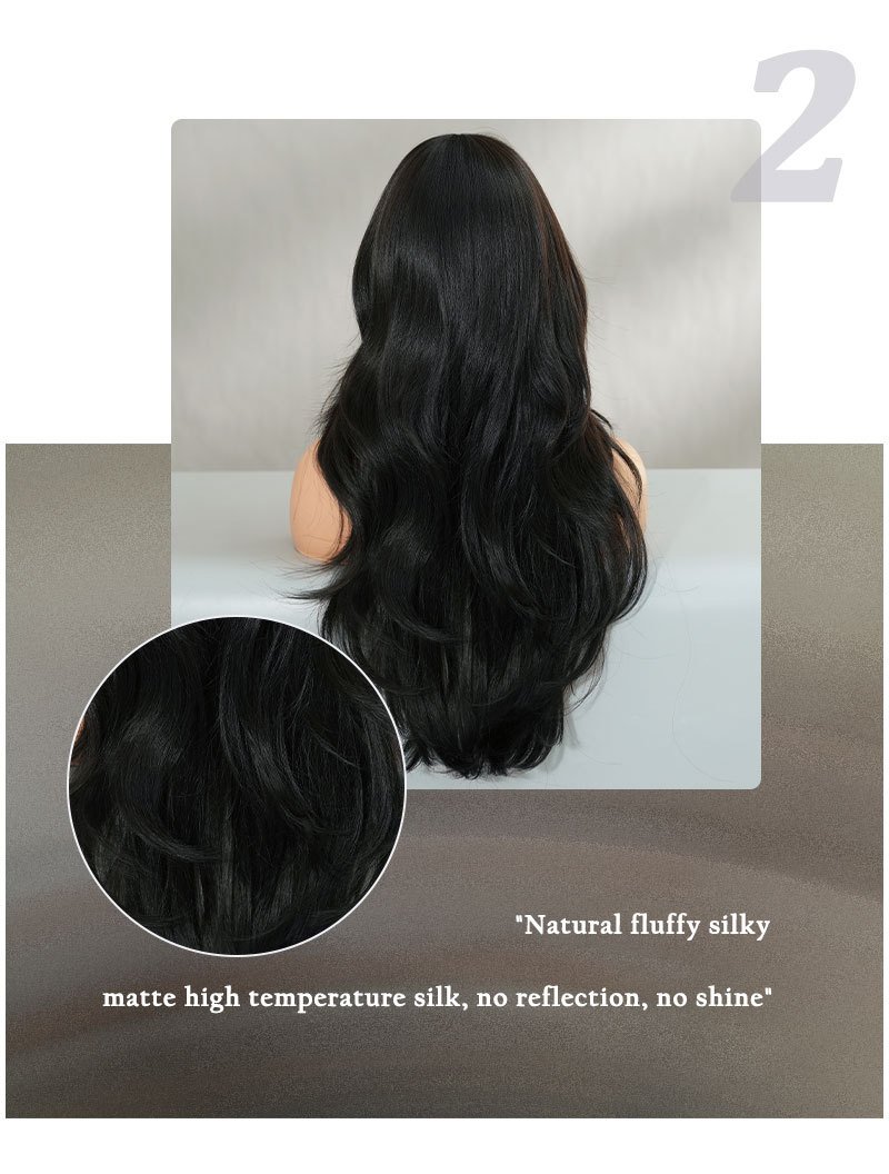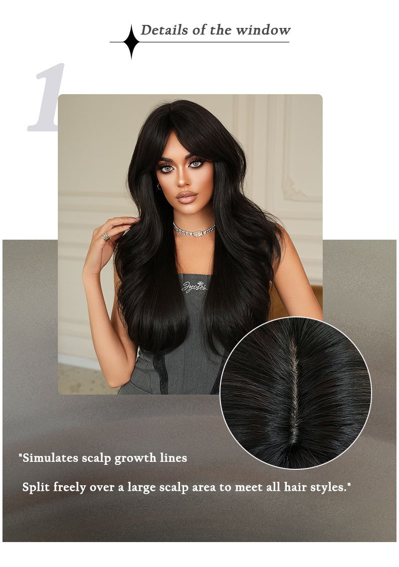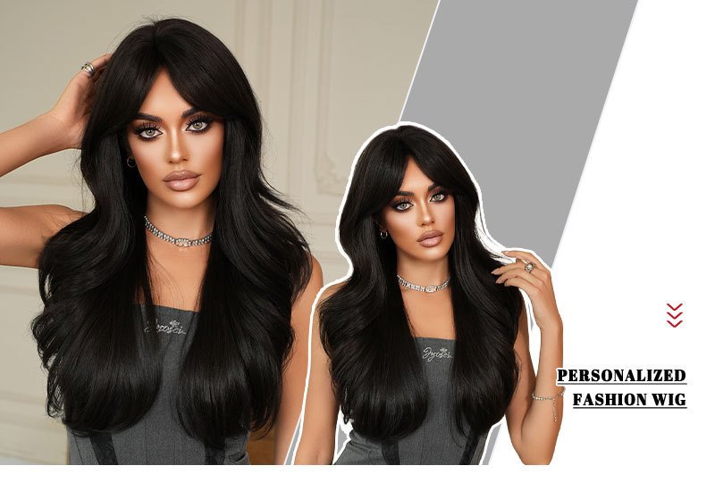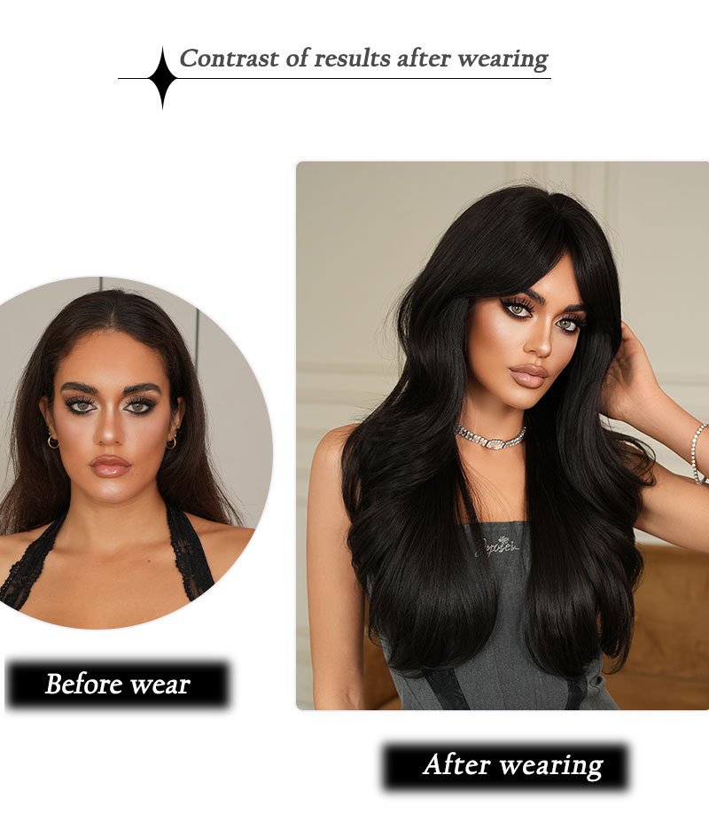 High-quality 26in wig women’s long wavy black curly hair eight-character bangs for age-reducing natural hair