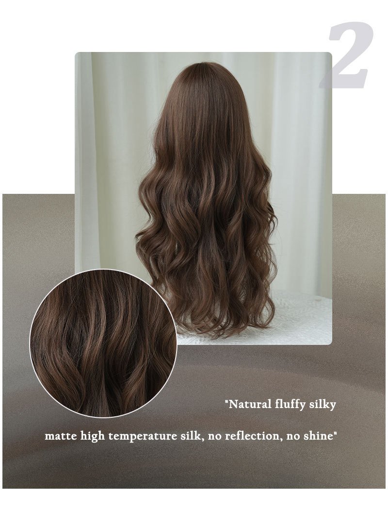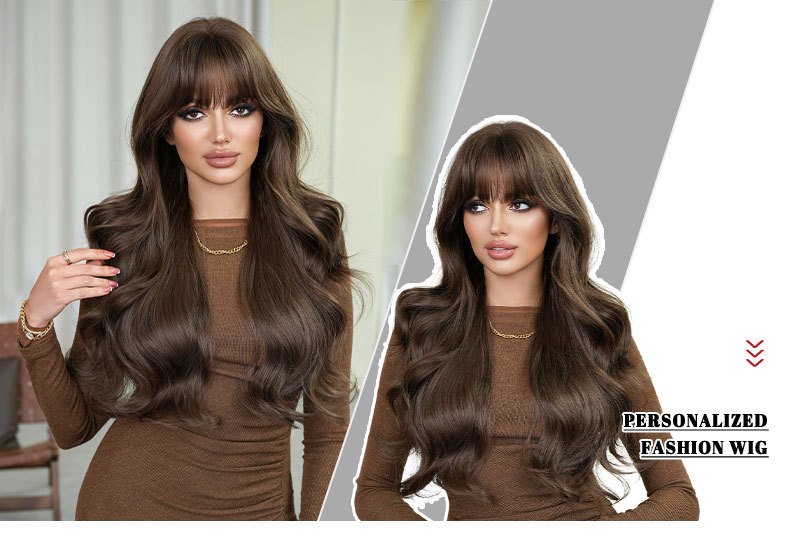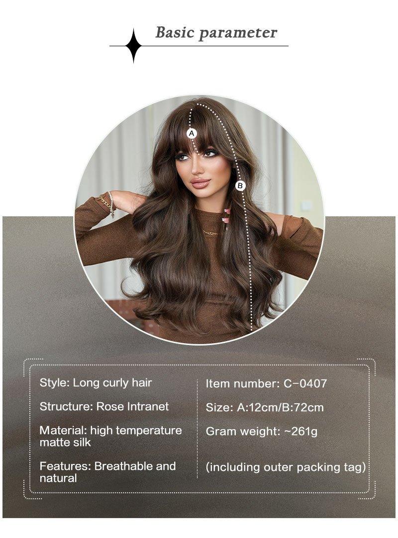 Natural Black Tea Brown Qi Bangs Long Curly Hair Wig Girls' Full Head Cover High Quality Wig for Daily Use