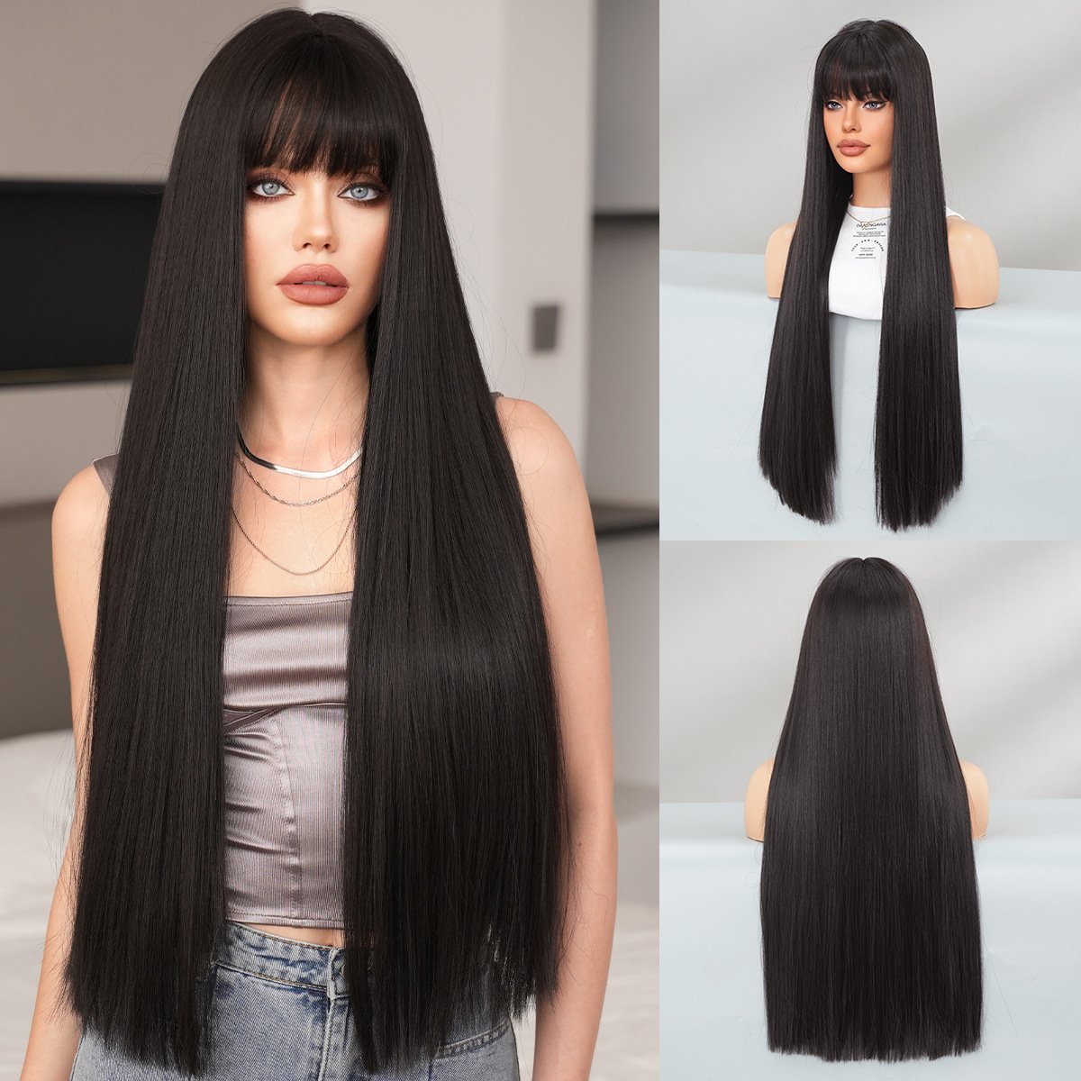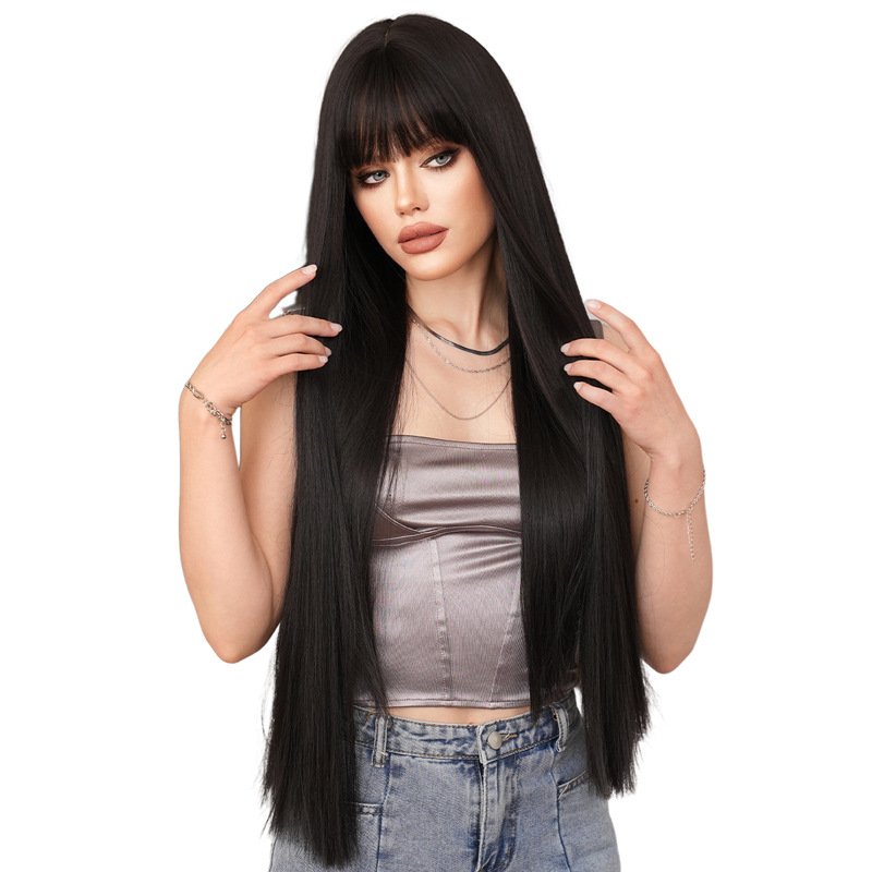 High Quality One-size-fits-all Super Long Straight Hair 28in Wig Women’s Straight Bangs Daily Age-reducing JK Black Wig Set for Women