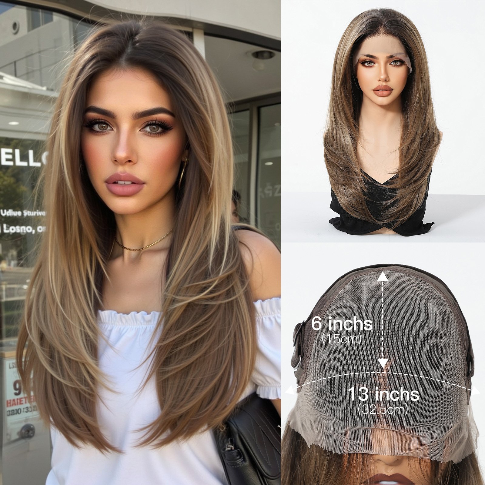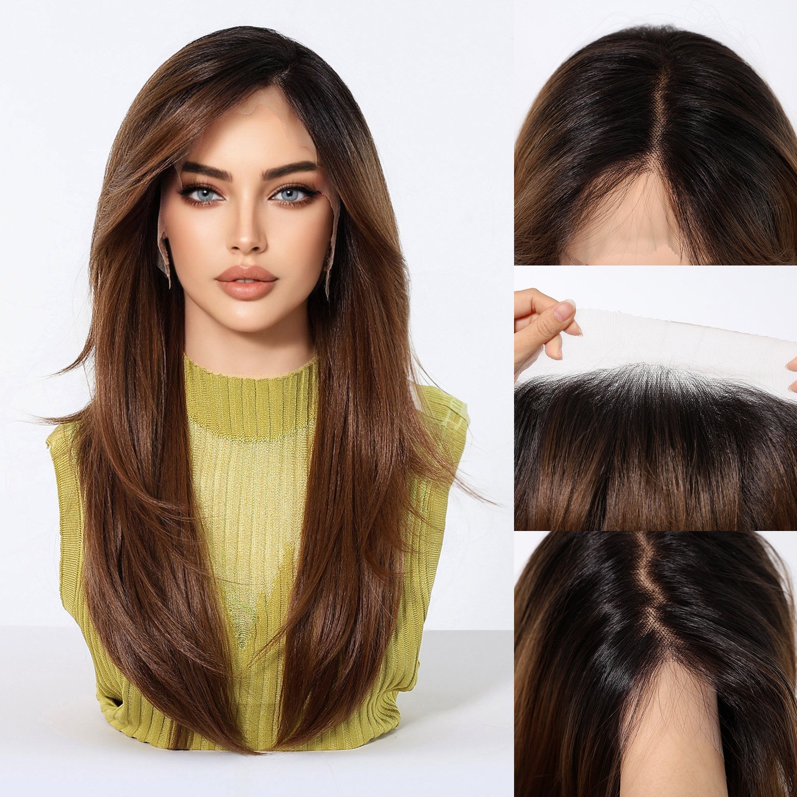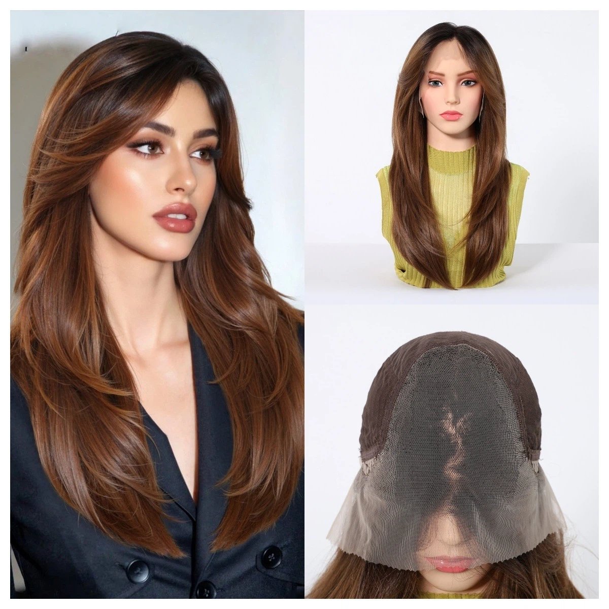 Large area hand hooked lace wig with gradient brown highlights, can be sewn freely, natural hairline full head cover