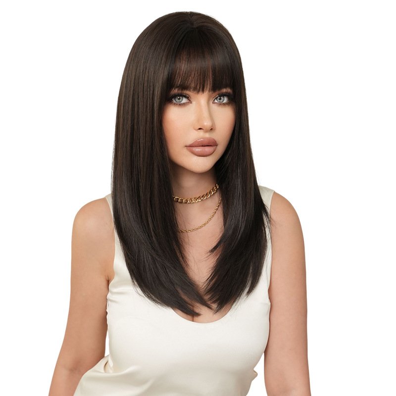 欧美跨境新款假发女八字刘海棕色大波浪长卷发日常机制化纤全头套