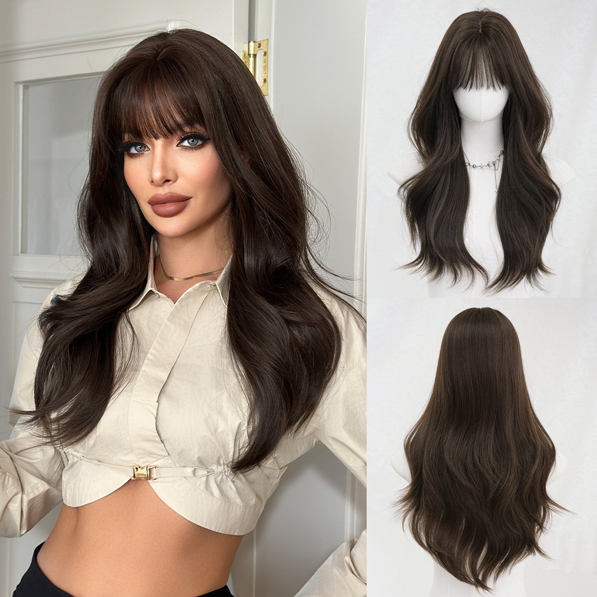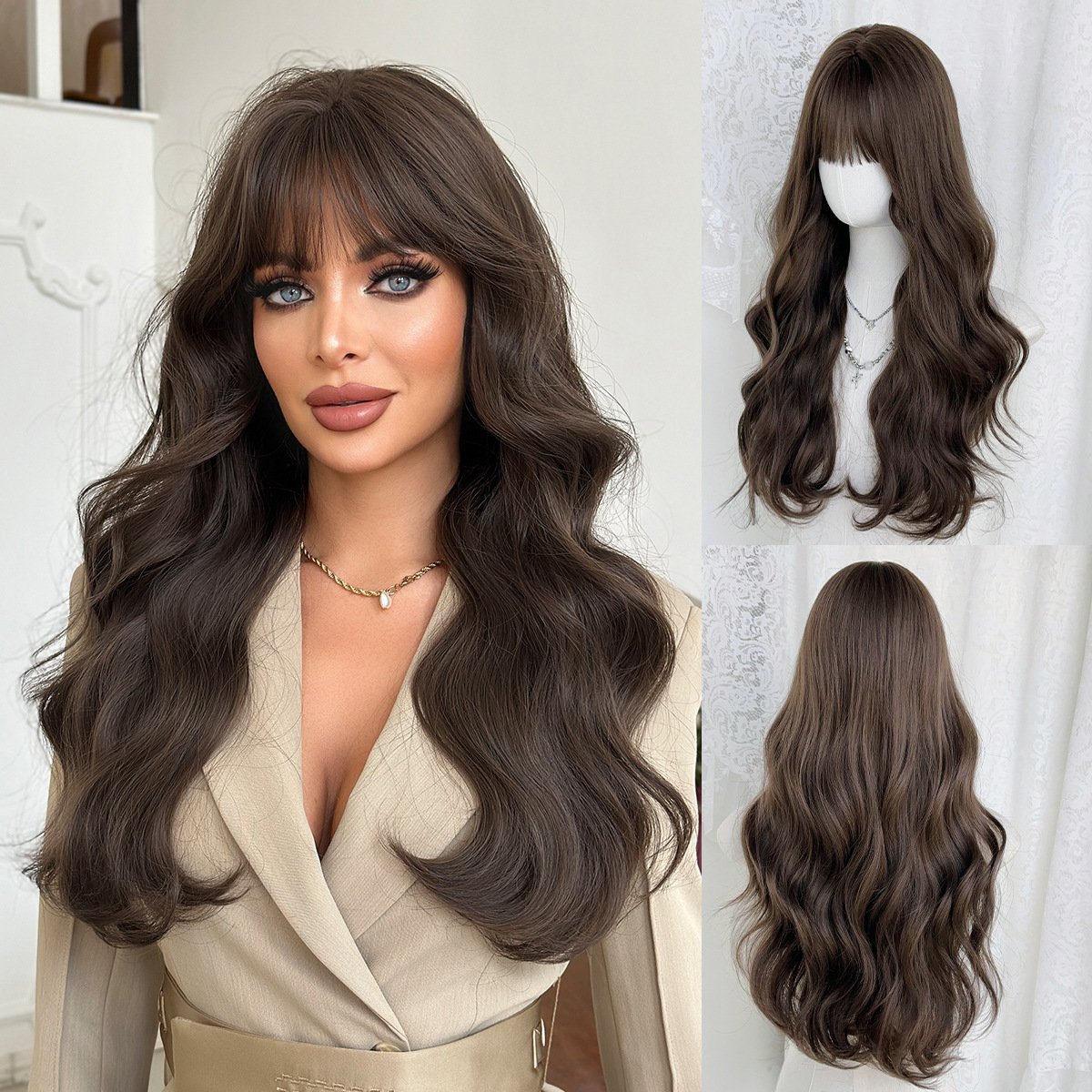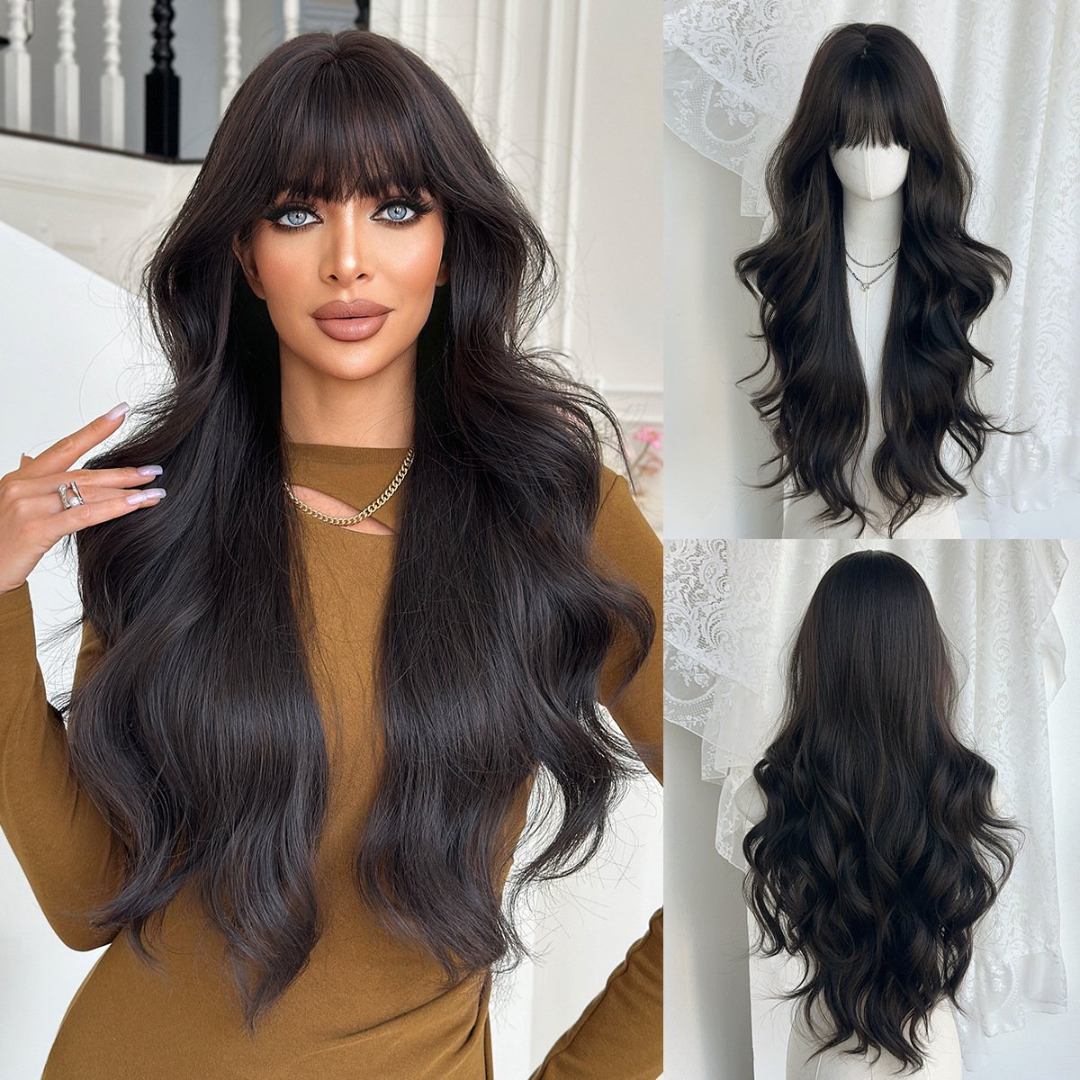 Natural Black Tea Brown Qi Bangs Long Curly Hair Wig Girls’ Full Head Cover High Quality Wig for Daily Use