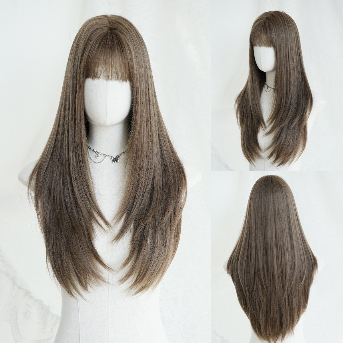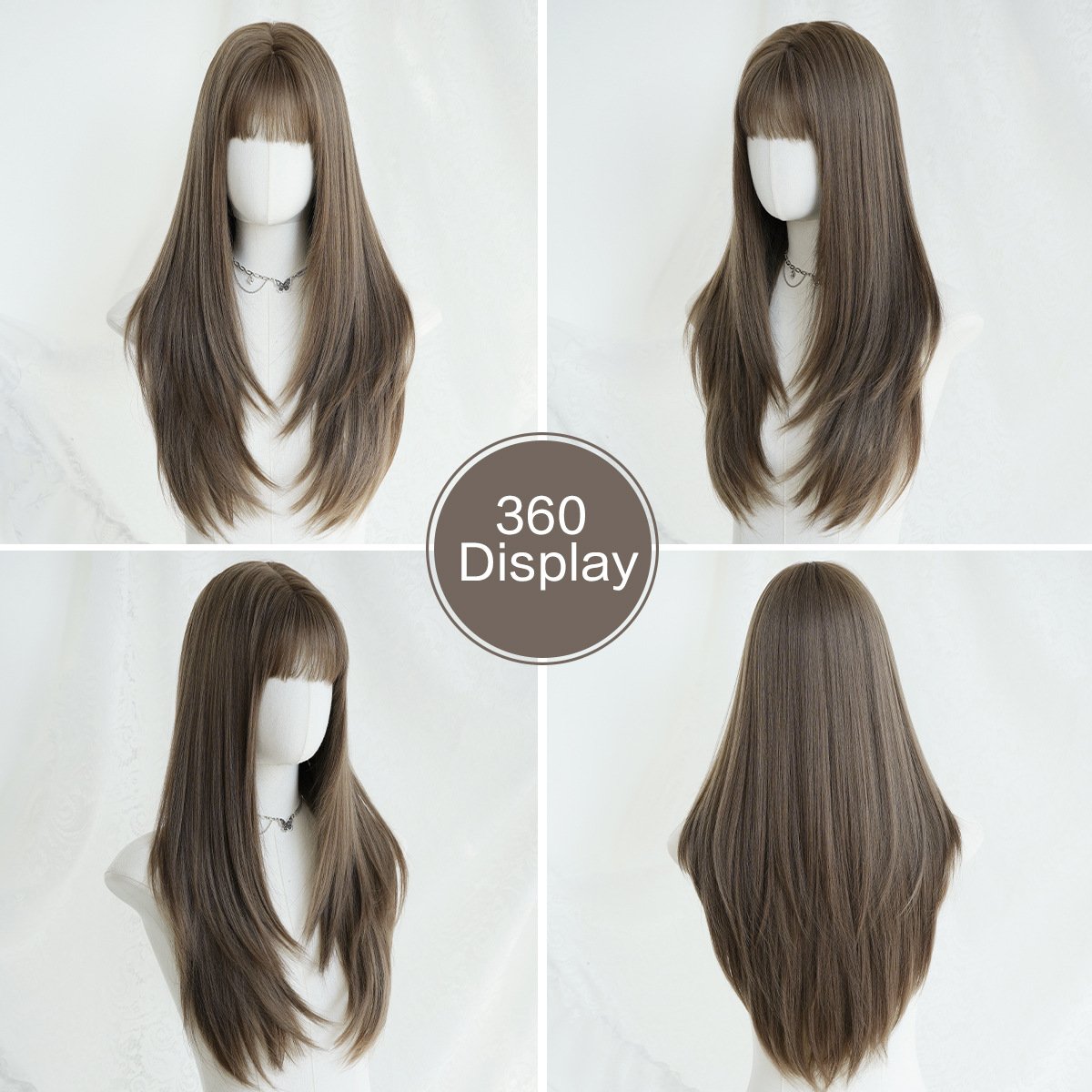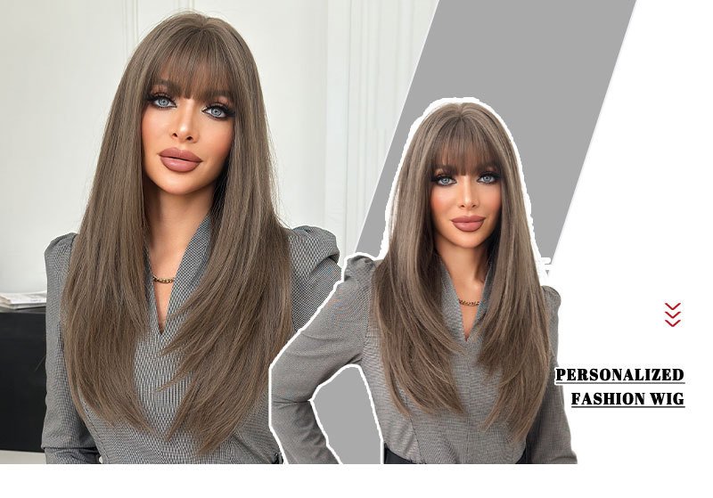 Model: Brown Hair Long Straight layered Wig with Bangs