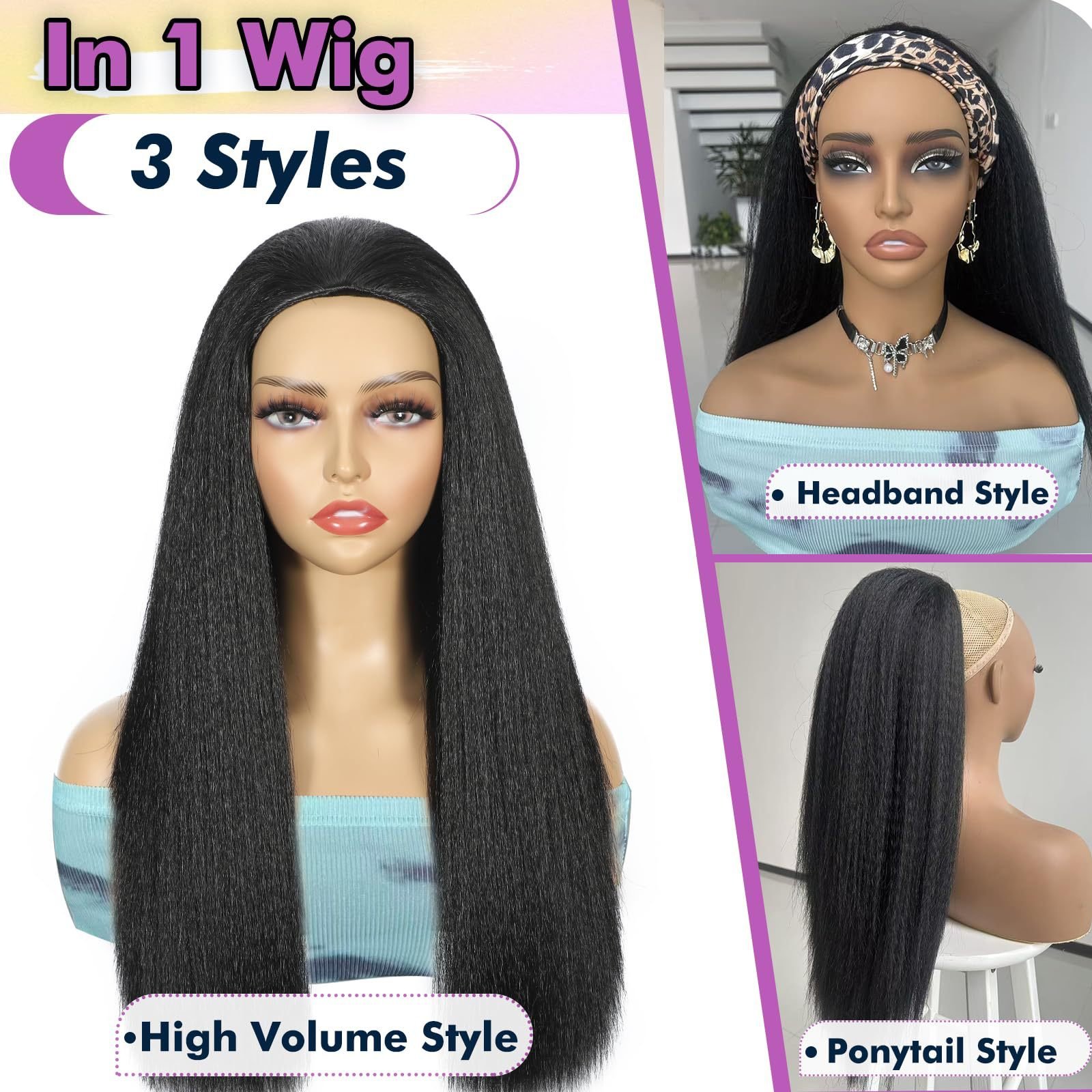 New Wig Women’s Black Silk Long Straight Hair Three-in-One Chemical Fiber Headset