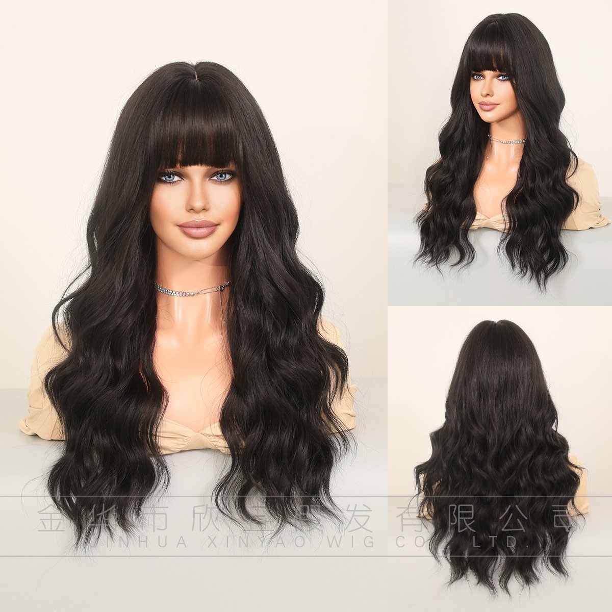 Wig, women’s air bangs, wool curls, medium long hair, small curly hair, high temperature silk headband