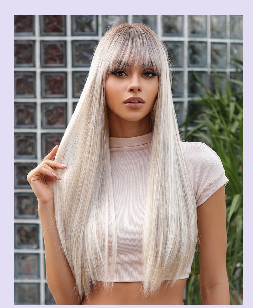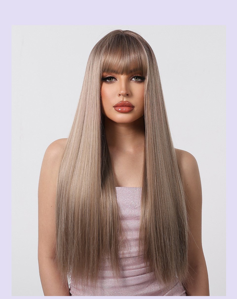 Qi Liu Hai champagne brown long straight hair temperament goddess wig synthetic full head cover
