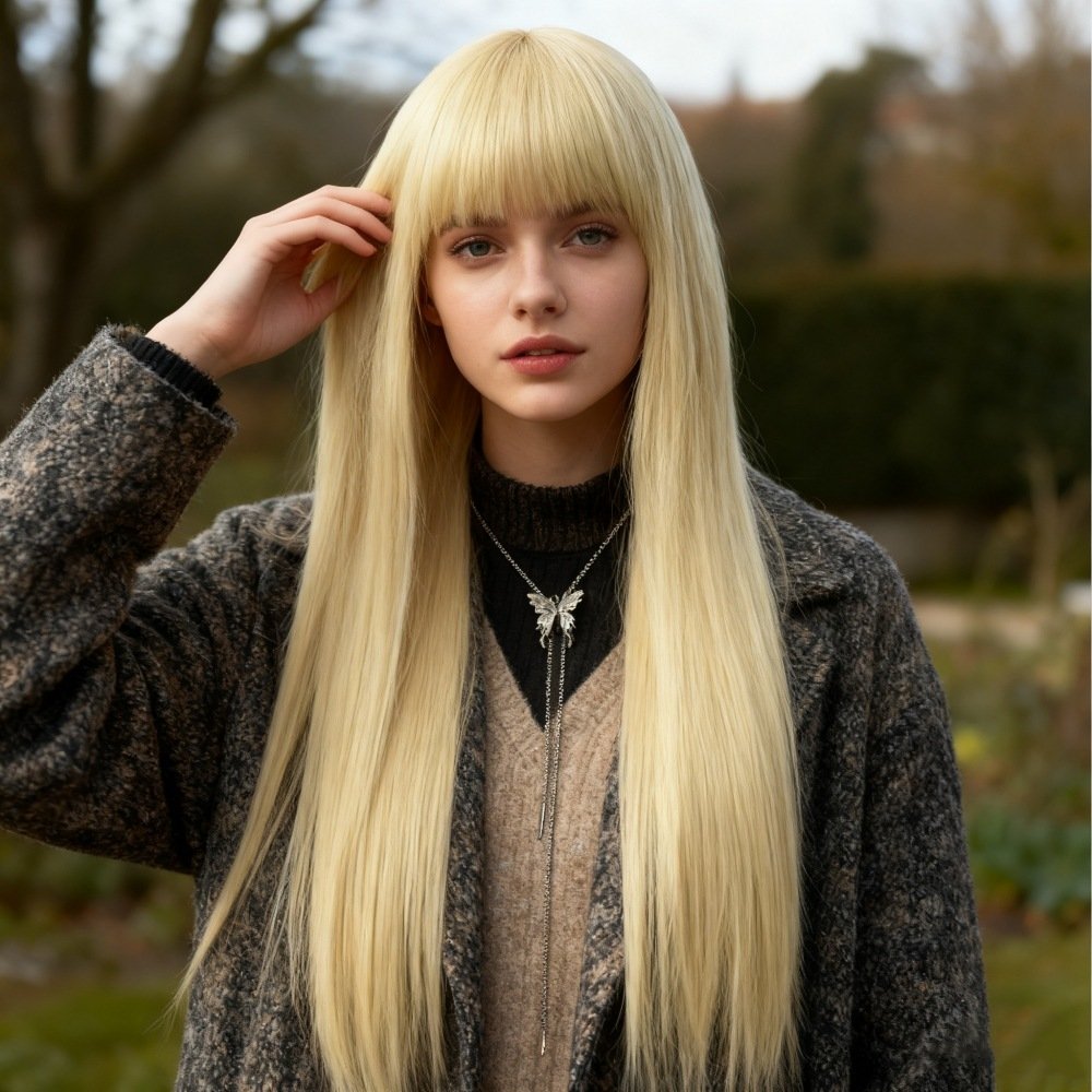 Long Straight Blonde with Curtain Bangs – Glueless HD Lace Luxury Wig