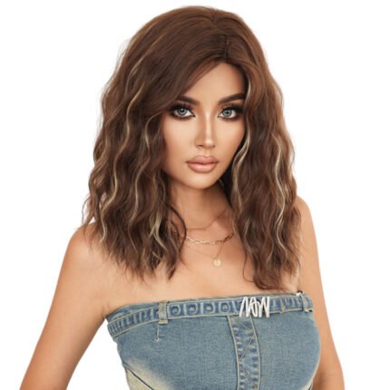 Natural Brown Wig Women’s Shoulder-length Curly Hair Side Bang Spotted Gold Chemical Fiber Heat Resistant Fiber Wig
