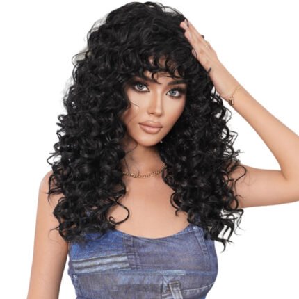 Spring Roll Wig Women’s Deep Wave Long Curly Hair Black Wig Air Bangs Full Head Cover