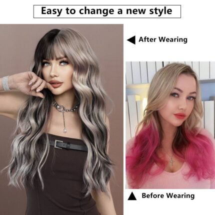 Silver Highlights Ash Wig Synthetic Long Wavy Wig With Bangs