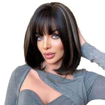 Women’s shoulder-length wig bob short straight black gold highlight-dyed inner-buckle layered wig full-head cover
