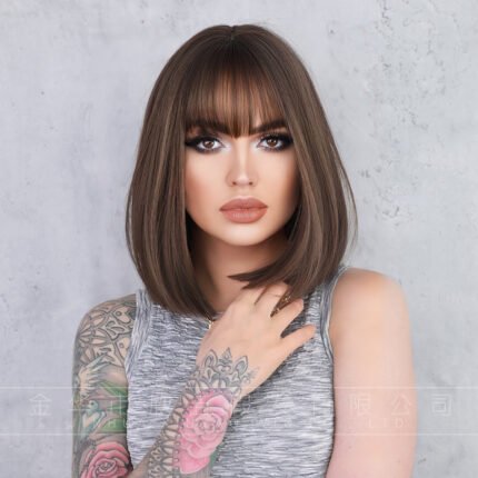 Yellow brown wig European and American women’s eight-character bangs layered short straight hair mechanism chemical fiber full head cover