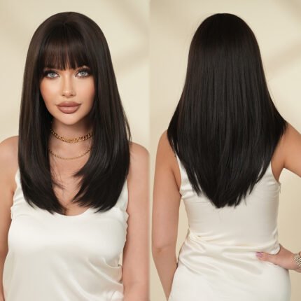 High quality 20in shoulder-length wig women’s natural black layered wig natural full head cover straight hair with bangs