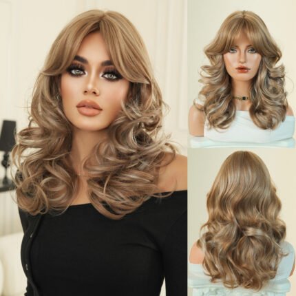 High quality 36in extra long wig women’s wavy curly hair neat bangs brown highlights gray heat resistant synthetic fiber wig