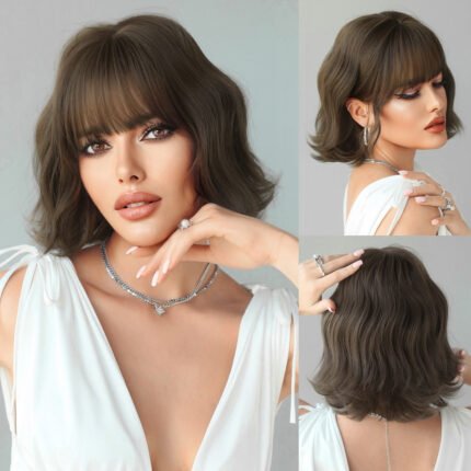 High quality 10in wig women BoB brown short curly hair rippled wig neat bangs mechanism wig headgear